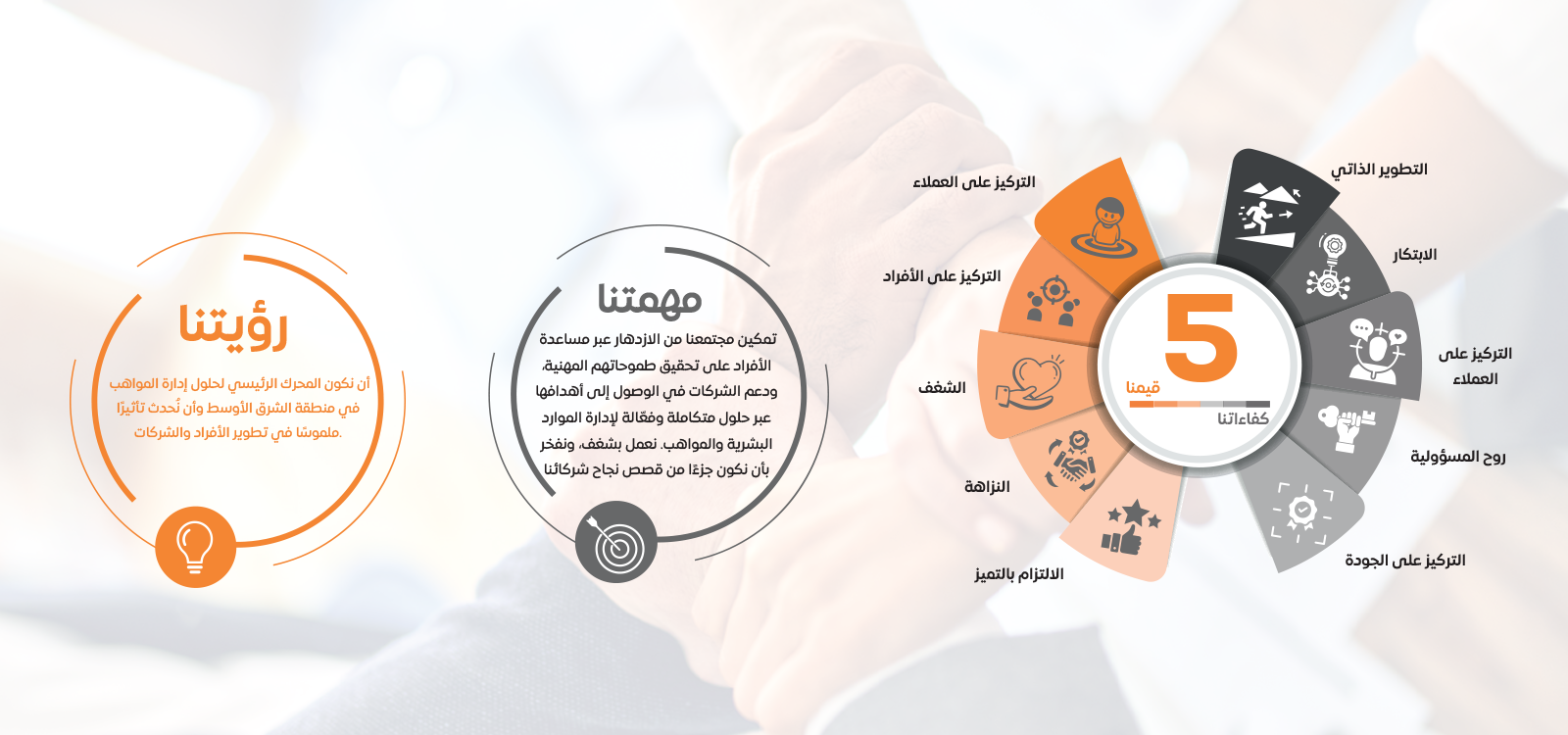 نحن نؤمن بأن نجاحنا يقوم على محورين أساسيين: رفاهية موظفينا ورضا عملائنا. ومن خلال خدماتنا المتكاملة في الاستشارات، إدارة الرواتب، التوظيف المحلي والدولي، التدريب، و الاستعانة بمصادر خارجية، أصبحنا شريكًا موثوقًا يقدم حلولًا عملية تدعم الأفراد والمؤسسات على حد سواء.